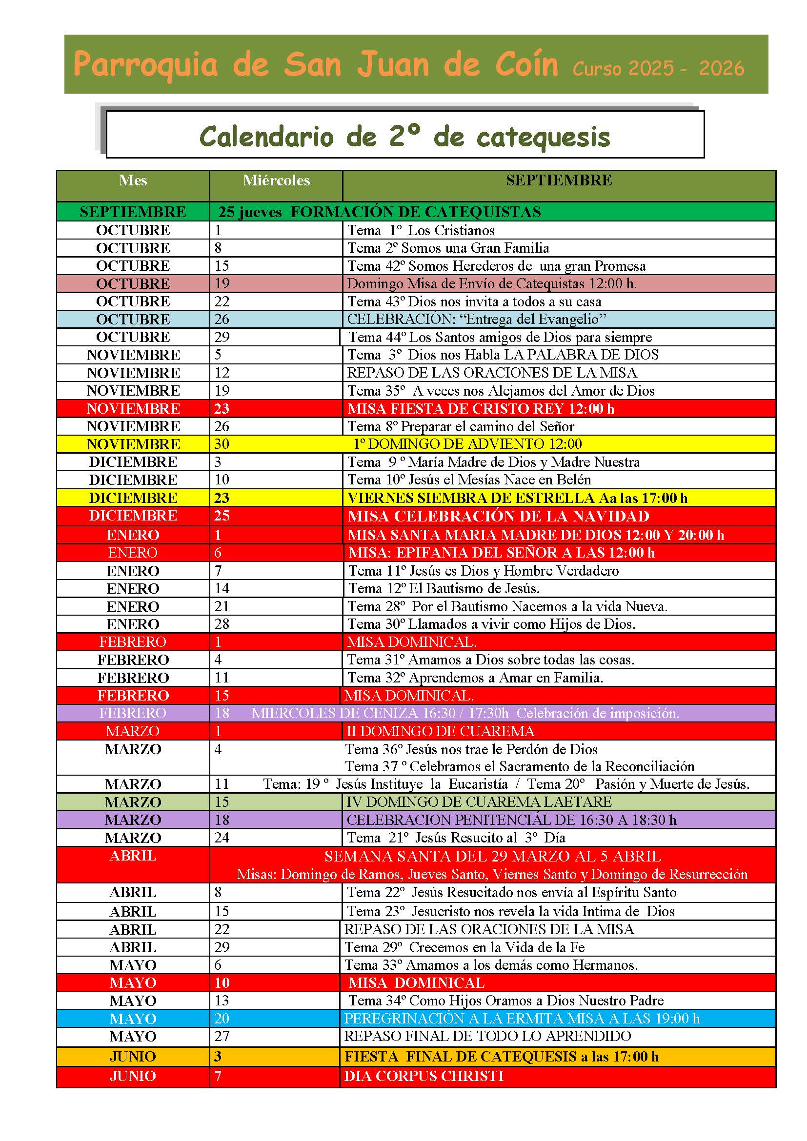  Loa niños de 2º tendrán que asistir al menos a las misas señaladas en el calendario en barreado de colores.